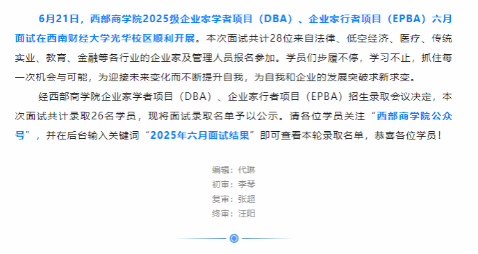 恭喜录取!|西部商学院2025级企业家学者项目(DBA)、企业家行者项目(EPBA)六月面试圆满结束