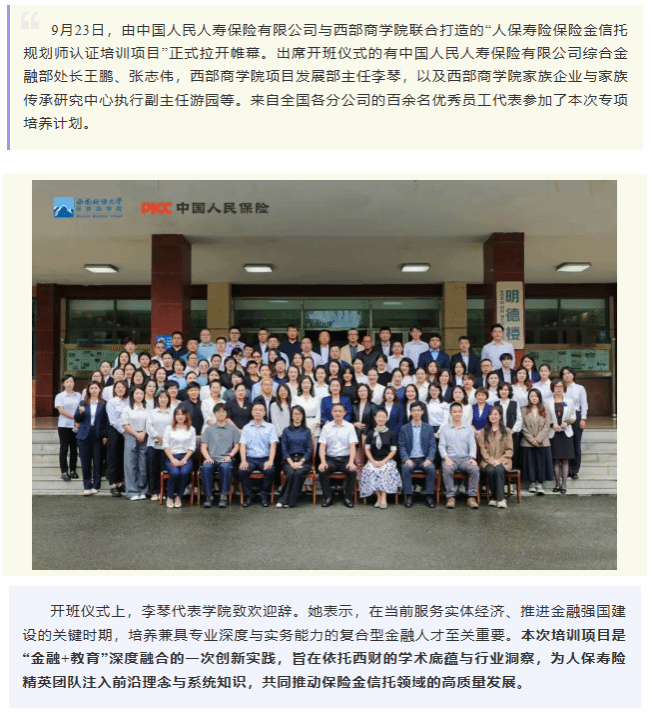金融强国,人才支撑|人保寿险携手西部商学院启动保险金信托规划师认证培训项目